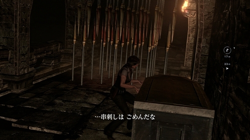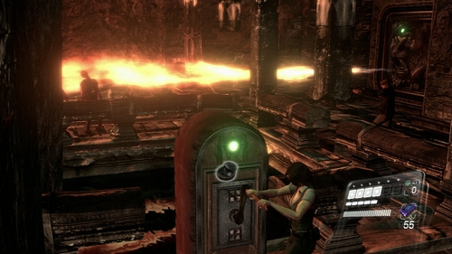 回転刃に火炎放射に串刺し、行く手を阻む凶悪なトラップを掻い潜り、時には協力してそれらのトラップを解除していく。勿論、シリーズ恒例のクランクを使った仕掛けも用意されている。「まーたクランクか」と溜息が出たのは言うまでもない。一応、これは私有地みたいなので侵入者防止用のトラップなんだろうけど、それにしてもやりすぎ感はありますよね。こういった仕掛けは初代からずっと続いているので「バイオハザードの世界なら仕方ない」と割り切っていますが…