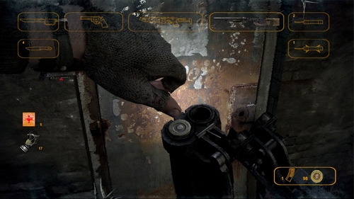 特徴的なのはそこだけではなく、この世界観だからこそ光る要素も多く用意されていてゲームとして面白く機能している。例えば地上などの汚染されているエリアを通る時はガスマスクの装着が欠かせず、もし装着しないままで居ると死に至ります。ガスマスクはセットしているフィルターが徐々に劣化していき、しかも敵の攻撃を受けたりするとガスマスク自体が壊れるので注意。危なくなってきたら道中に落ちているガスマスクと交換するなどして防護している状態を維持していかなければならない。それと攻撃を受けた時にガラス部分にヒビが入って視界が見難くなり、息が荒れてくるとガラスが曇るのには拘りが窺える。