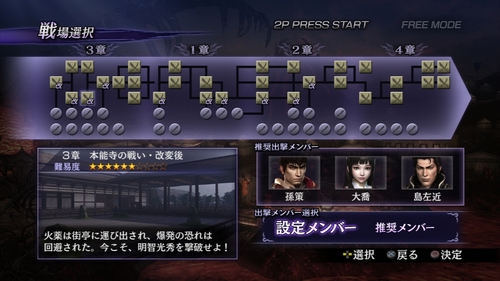チームメンバーは自分で好きな武将を選べる“設定メンバー”とそのステージでの出撃が推奨されている“推奨メンバー”があり、推奨メンバーで遊ぶと専用会話など発生しやすくなります。尤も、推奨メンバーじゃない武将でも専用会話がある場合もありますが。即ち、偏らずに満遍なく色々な武将を使いたい & 雰囲気を重視するなら推奨メンバーでプレイすると良いですよーってことですね。それと一度クリアしたステージではBGMの変更が可能です。選りすぐられた数々の名曲の中から好きな曲で戦闘を楽しめます!