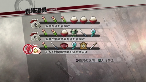 他にも前作のような技能システムは廃止されましたが武器や防具(鎧・籠手・足袋)に技能が付加されるようになりました。更に新しい要素として携帯道具が登場し、これを使って戦闘を有利に進めることが可能です。