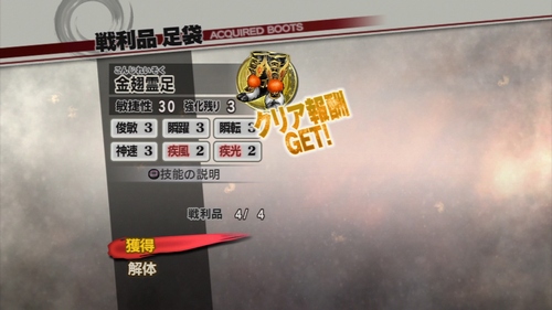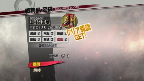 今回獲得したのは第1レア防具の“迦楼羅霊足”と第3レア防具の“金翅霊足”という足袋。相変わらず第3レア防具の技能がかなり良い。高難易度向けに構成された技能なので「修羅」で遊ぶ時には凄く頼りになります。ステップ開始時に無敵時間が発生するチート技能【瞬躍】に、緊急回避終了の際の無敵時間が増加する【瞬天】など、ダッシュしているだけで無双&練技ゲージが増加する【疾風】【疾光】など、まさに足袋の技能として完璧な構成です。既にこれで完成しているので技能の書き換えはせずに【疾風】【疾光】を強化するだけでいいかな。