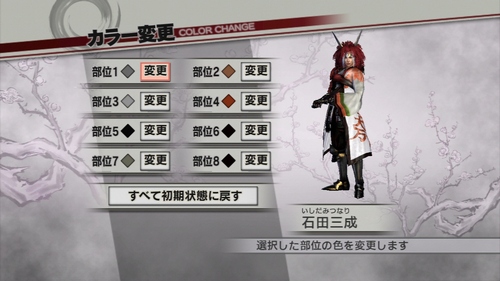 本作では衣装変更はなく色違いの2Pカラーすらありませんが、これのおかげで自分好みの配色にできるのは嬉しい。衣装の様々の部位以外にも髪の色や肌の色も変更できます。これで官兵衛殿の顔色を良くすることだってできます!気分転換に配色を変えるも良し、奇抜な配色にして楽しむも良し、衣装変更が無いのは残念でしたがカラー変更もまた一興。ただし、初期の配色に戻すとまた再設定する必要があるので面倒。変更した配色を2Pカラーとして保存できればよかったのになぁ。