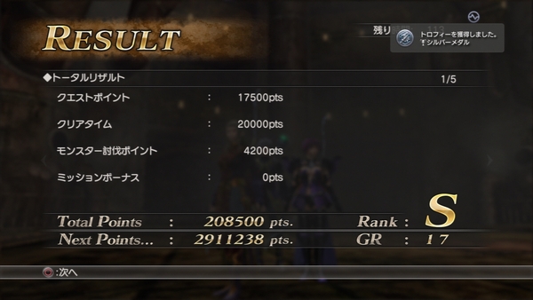 現在ではPSNにサインインしている状態でクエストをクリアすることでギルドポイントが増加するのでそれを利用して稼いでいます。PSNサインイン状態+Sクリアで大体209,000ptsほど。本来はこの四分の一しか貰えないのでそう考えるとかなりウマいと思う。これを何十回何百回と繰り返してギルドランクを上げてやろうと画策しているけど、果たしてどこまで私の気力が持つのやら。