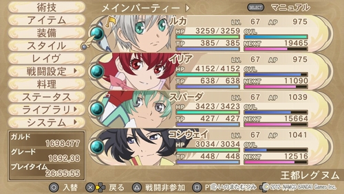 一周クリア後、現在の平均パーティレベルはLv.67。このレベルだと殆どのキャラクターの術技はもう全部習得したって感じかな。今作ではスロットシステムを採用したおかげで右スティックにも4つの術技を割り当てられ、コンボも更に幅が広がって楽しいです。