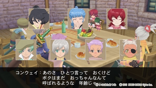 パーティには今作から新たにコンウェイとキュキュが加わり、8人になりました。2人とも異世界トライバースからきた住民らしい。コンウェイは「二つの魂を救済する」という目的で、キュキュは「この世界にある様々なものを見たい」という目的で旅に同行する。どうも謎が多い2人ですが、エンディングやそれまでの行動を見る限り重要なキャラクターであることには間違いないでしょう。