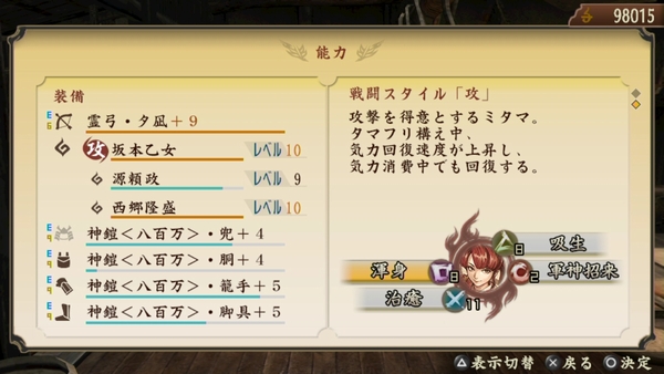 現在どこまで進んだかというと、とりあえず終わってなかった七章の「討鬼伝」をクリアしましてストーリーは無事完了したので、この勢いで集団任務の進行度十の「討鬼伝」もクリアしてやるぜ!って感じです。今回のプレイ日記でその模様をお伝えします。さて、これまで武器は槍を一途に使い続けていたのですが、気分を変えて違う武器を使ってみようと思い、現在は弓を使っています。聞けば一閃を重ねて猛進閃を付けた火力特化の“猛進弓”というのがあるらしく、自分もそういう風にミタマを構成してみました。
