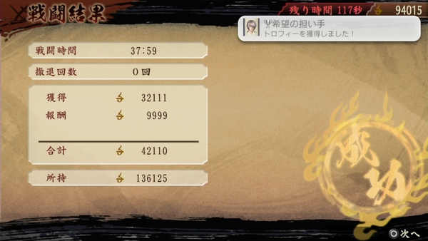 戦闘時間は38分ほど、さすがに疲れます。「討鬼伝」クリアの伴い進行度十を終えたのでトロフィー『希望の担い手』も取得。
